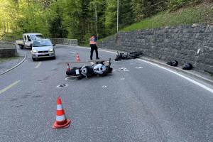 Im Bereich der engen Rechtskurve, unmittelbar nach der Bruderbachbrücke geriet der Töfffahrer mit seiner Maschine über die Fahrbahnmitte und stiess gegen ein entgegenkommendes Motorrad, welches von einem 50-Jährigen gelenkt wurde.