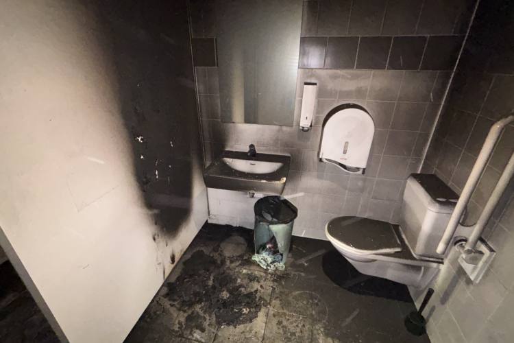 Das Feuer beschädigte die angrenzende Toilettenwand, zudem wurde der Raum durch den Mottbrand stark verrusst.