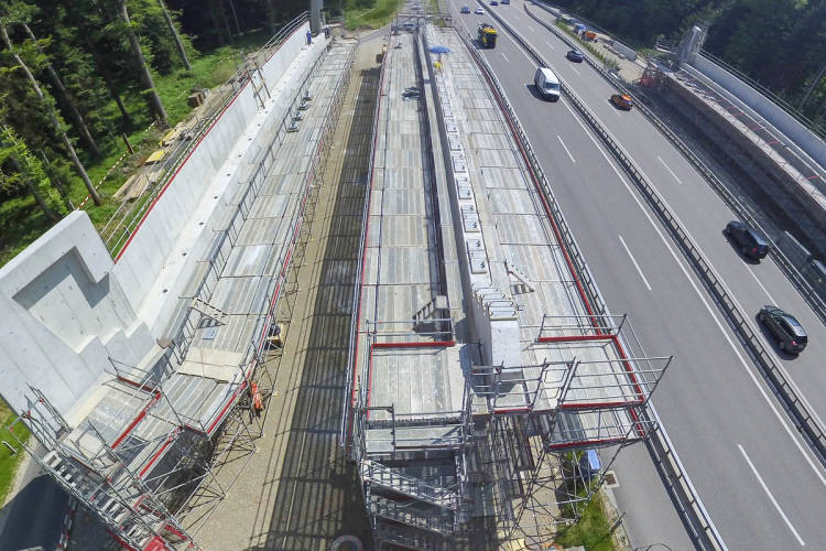 In einem ersten Schritt werden nun die Holzträger in mehreren Nächten über die Autobahn eingehoben, danach durch den Tag über die Kantonsstrasse. Anschliessend werden die Böschungen auf beiden Seiten erstellt.
