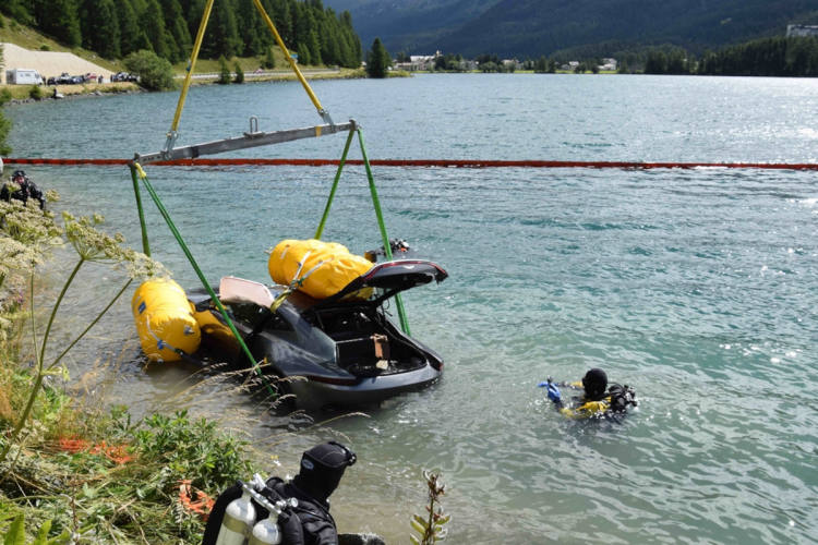 Rückwärts rollte das Auto eine Böschung hinunter in den Silsersee. Noch bevor das Fahrzeug im See vollständig versank, konnten sich die beiden Insassen selbstständig aus dem Auto befreien und sich ans Ufer retten.