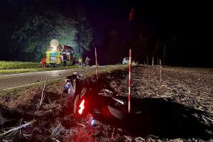 Er kollidierte mit einem entgegenkommenden Lieferwagen, stürzte und blieb im angrenzenden Wiesland liegen. Der Zweiradlenker ist durch die Kollision schwer verletzt worden und musste in kritischem Zustand mit einem Rettungshelikopter in ein Spital geflogen werden. Der 45-jährige Lieferwagenlenker blieb unverletzt.