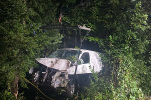 In der Folge geriet der Lieferwagen über das Strassenbord und stürzte die Böschung hinunter, wo dieser mit Bäumen kollidierte und so zum Stillstand kam.