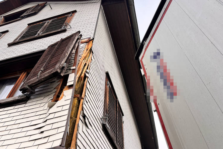 Heute, am 31. Oktober 2025, blieb in Schellenberg ein Sattelschlepper mit Auflieger in einer engen Kurve stecken. Beim Versuch, sich zu befreien, beschädigte der Fahrer eine Hausfassade.
